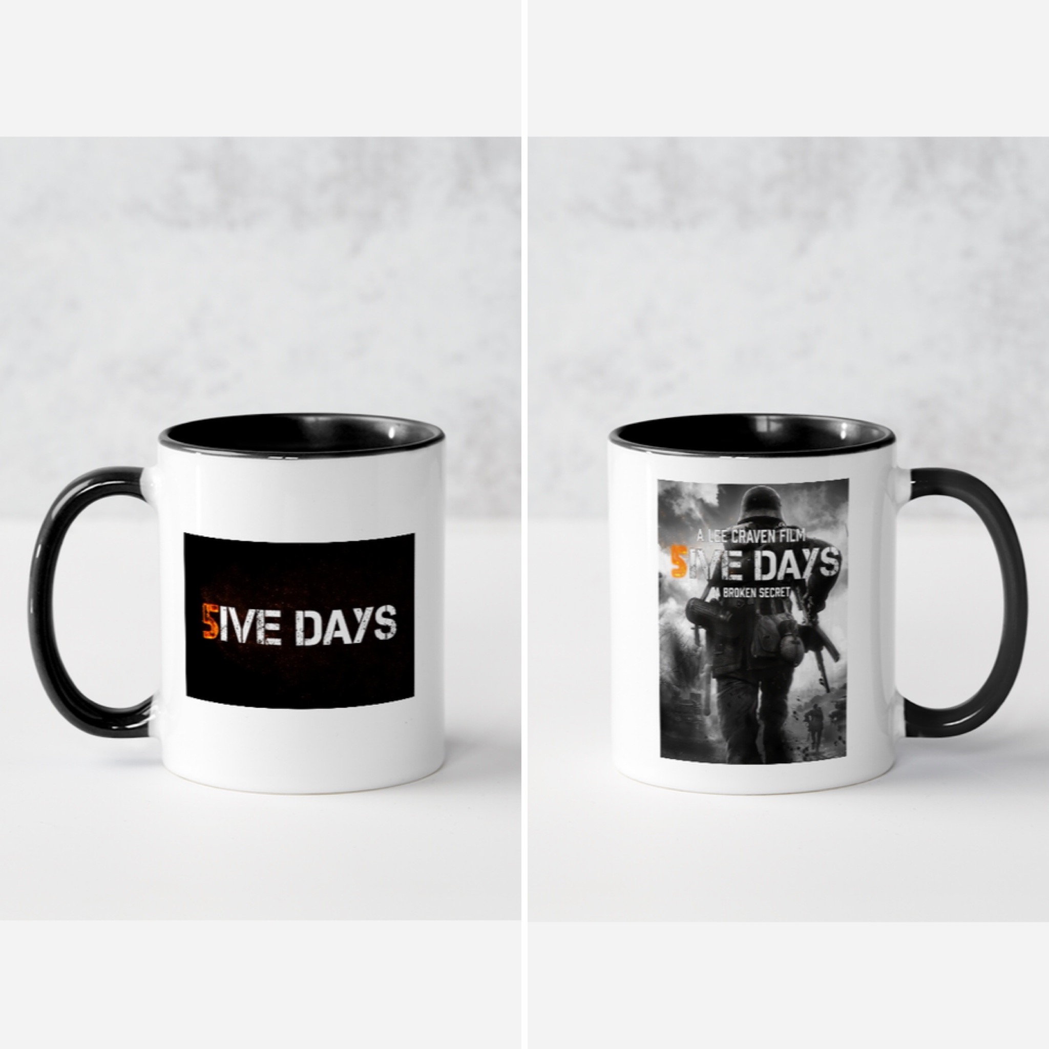 White and Black custom 5IVE DAYS mug. Option to have one or two personalised prints.